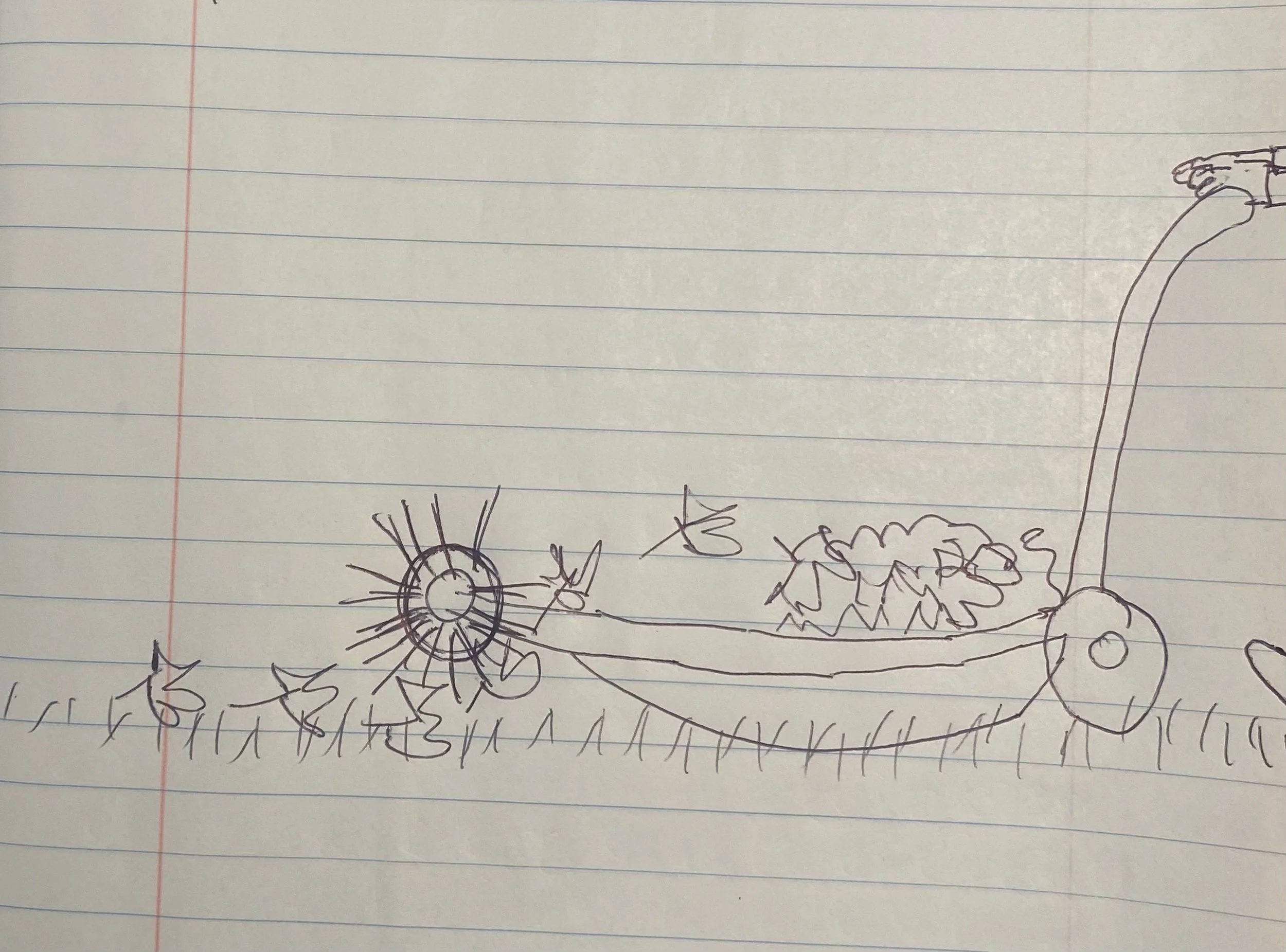 The leaf contraption. As you push it forward, a wheel with plastic bristles on the front spins and sweeps leaves up into the air (supposedly) and they land in a canvas pouch. In reality, the spinning bristles often fail to grab the leaves and you just have to pick the leaves up by hand and put them into the pouch.